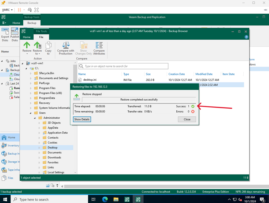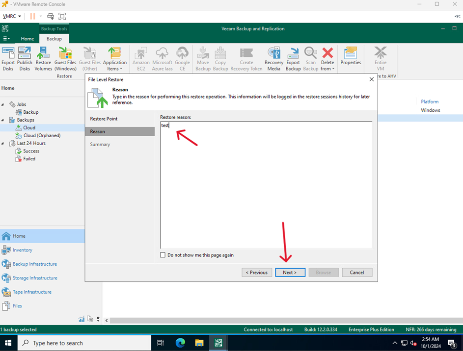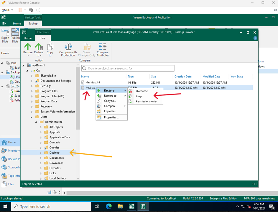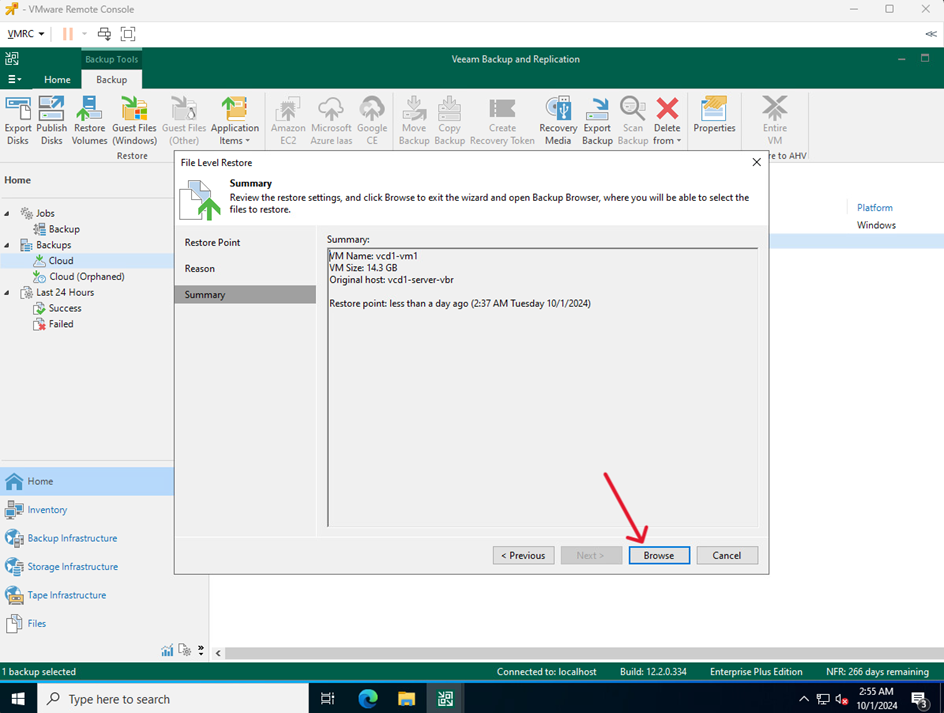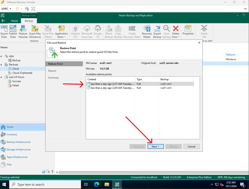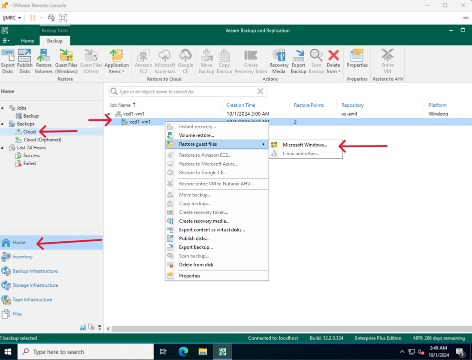 In VM with Veeam go to Home > Backups > Cloud then select the backup job you have performed, right click and select Restore guest files > Microsoft Windows…