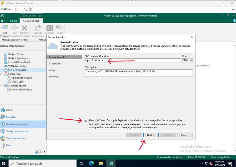 • Wprowadź otrzymany adres DNS,  zaznacz pole wyboru jeżeli masz podpisaną umowę na zarządzany backup z dostawcą usług.
