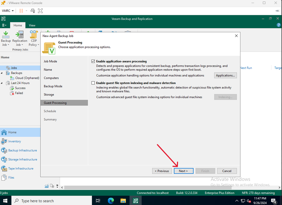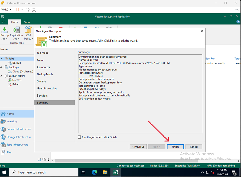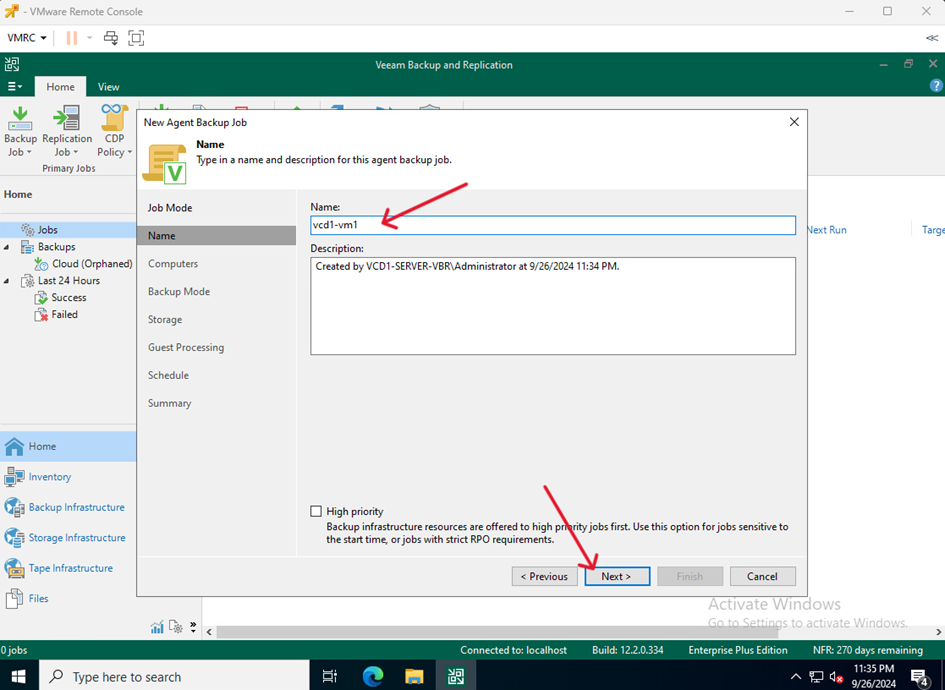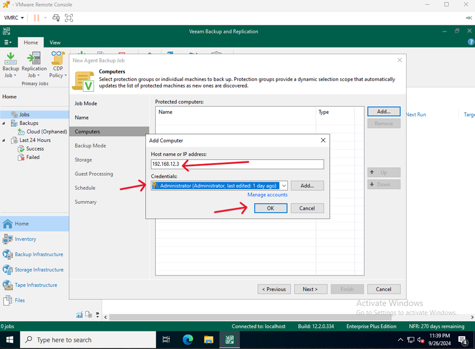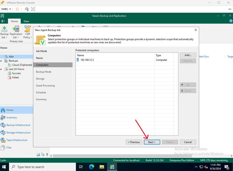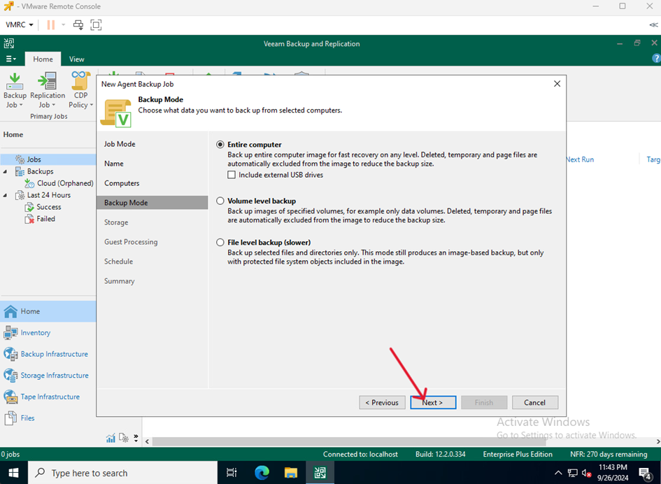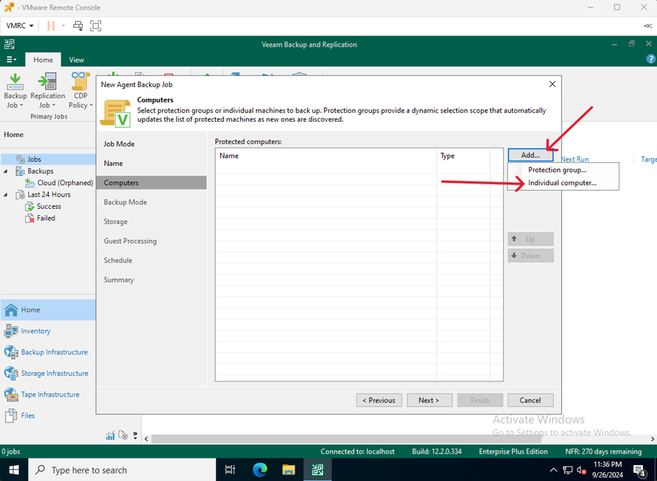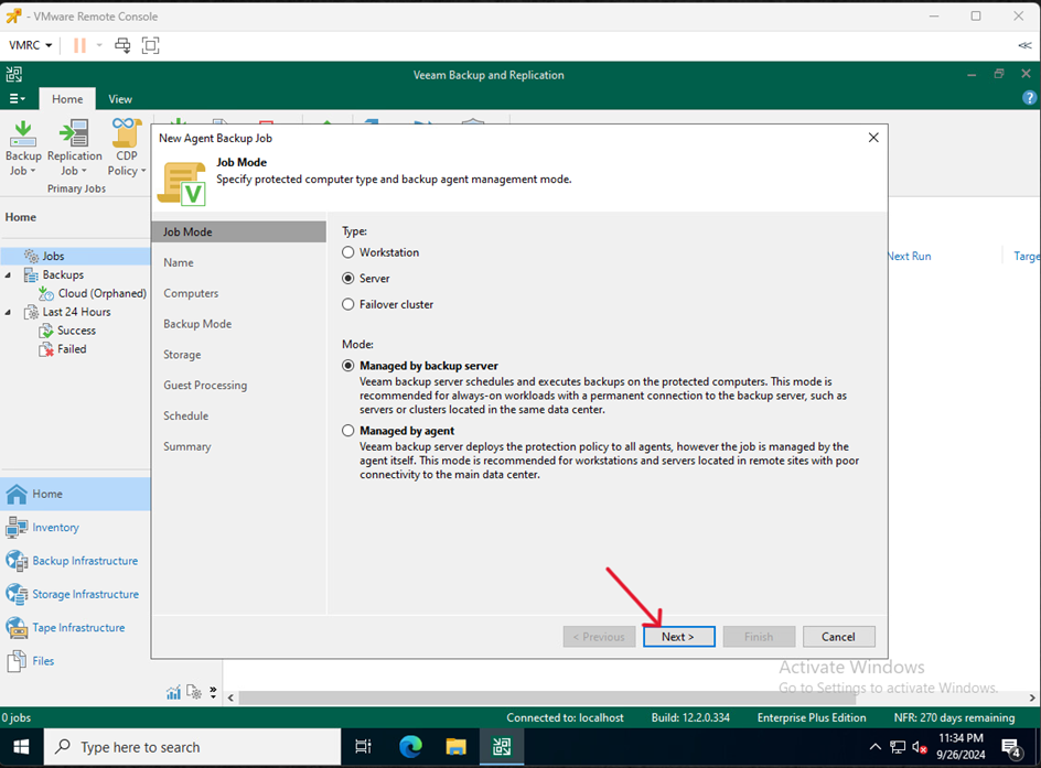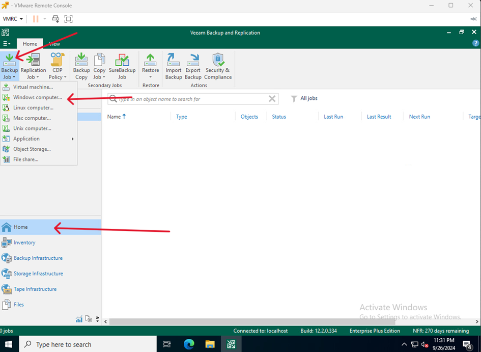- Na VM służącej jako Veeam Serwer przejdź do Home kliknij Backup Job i wybierz Windows computer…