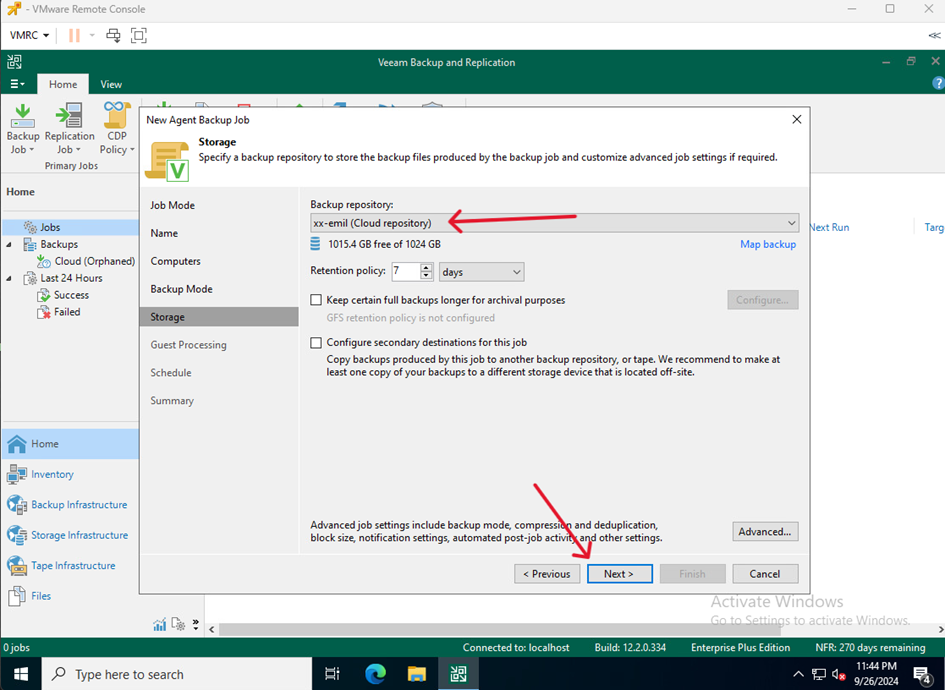 - Wybierz repozytorium, na który mają trafiać kopie zapasowe, dostosuj ustawienia i kliknij Next.